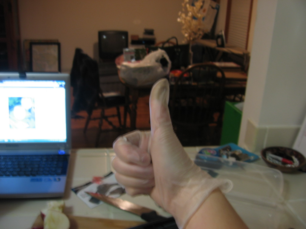 I washed the fruit. I put the correct spacer for the slice size I wanted. Then I peeled the sticker off the blade. The sticker that says “SHARP BLADE: Use Extreme Caution When Handling”. No joke I had this thought while I was pulling it off. Well, duh it’s sharp. It’s a slicer. What dumb idiot needs this caution sticker. That should have been my warning. Oh wait. IT WAS! I pulled a knife of my new knife magnet, sliced the fruit, and stuck a piece of apple onto the safety handle thingy for the slicer. And made my first slice. And it was perfect. And I made 4 or 5 more slices. And then the apple piece fell from the handle. Probably because I wasn’t using it correctly. But I didn’t feel like reading the little manual. So I just went with it. And pushed the apple down against the sharp blade. And then pushed my thumb through the blade. It just barely nicked the outer edge of my thumb. And the whole wound is about the size of a pencil eraser. And it really didn’t hurt. But it was bleeding. A lot. This happens when you cut yourself with a sharp blade because it makes a clean cut. I was actually surprise I didn’t swear. Or make any noise at all for that matter. I just walked to the bathroom and pulled out all the wrong bandaids. I searched all through the bathroom. A task made more difficult by the absence of a functioning right thumb. Finally I decided to just slap one on until I was done with the sangria. This next part is a little icky. It was bleeding through the bandaid. At that point I went and found the correct size bandaid. And while my left hand was trying to doctor my right hand all I could think was where’s my Top Chef paramedic? I really need one of those guys to swoop and take care of this business. Which got me thinking. I might keep bleeding. I have latex gloves from an old craft project. I put one on over the next round of bandaids to make sure I didn’t get any blood near the sangria. Food safety first. Always.