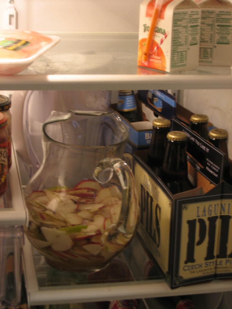 I got home, popped the pears in a brown bag to help ripen them a bit more, popped the wine in the fridge, and checked my spices. I made a mental note to buy whole cloves on the way home. Today I stopped to buy the cloves. The grocery store was a mad house. I guess everyone thought everyone else would be at work or still at home and not be at the grocery store. They were wrong. Also, someone needs to tell the woman in front of me in line that ugly sweater party season is over. And that she’s not actually supposed to wear the ugly sweater to the party. Luckily the 12 items or less line wasn’t too long. I came home and turned on the oven for the frozen pizza that would be my dinner. It takes 8 minutes to cook. PLENTY of time to cut the fruit for the sangria because I have that new fangled slicer. Um. No. It took my the entire Sugarland album that was also a Christmas present. In the recipe’s defense, quite a bit of time was dedicated to the stoppage of the blood flowing from my thumb. And searching for a band aid. Because the only ones in the medicine cabinet were for Jimmy Fund Walk blisters and were about six thousand times too big.