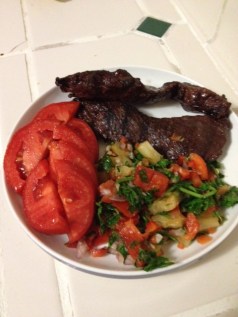 My thoughts overall are this. Paleo is great for short term. It’s got me thinking more and more about food as nutrition. And is helping me make much better food choices. But it’s hard yo. And a boat load of work. For instance, I went to the beach on Saturday. The beach is a thing in my family. Because we live so close I was raised to always have my beach bag ready to go and we’ll grab a bagel on the way and bring sandwiches and everyone will be happy. Well. No sandwich for me. Instead I had to pack a salad, cut fruit, raisins, almonds, and, no joke, 86 ounces of water/seltzer. We went later than I’ve gone in a long long time so breakfast was at home. No easy bagel, had to make eggs. And cut fruit. The salad was good. And so was the fruit. But my Mom’s special K chips looked so much better. We left around 6:30. It’s at least an hour ride home. I was starving. But there aren’t really any Paleo options around, it’s sort of a trashy boardwalk full of mostly fried stuff or pizza. Normally I would have gone for the pizza. Instead I bought a lobster, came home, cooked it, and made this salad. Yes, the salad was much better for me than the pizza would have been. But I didn’t eat until after 8:30. Hungry me!